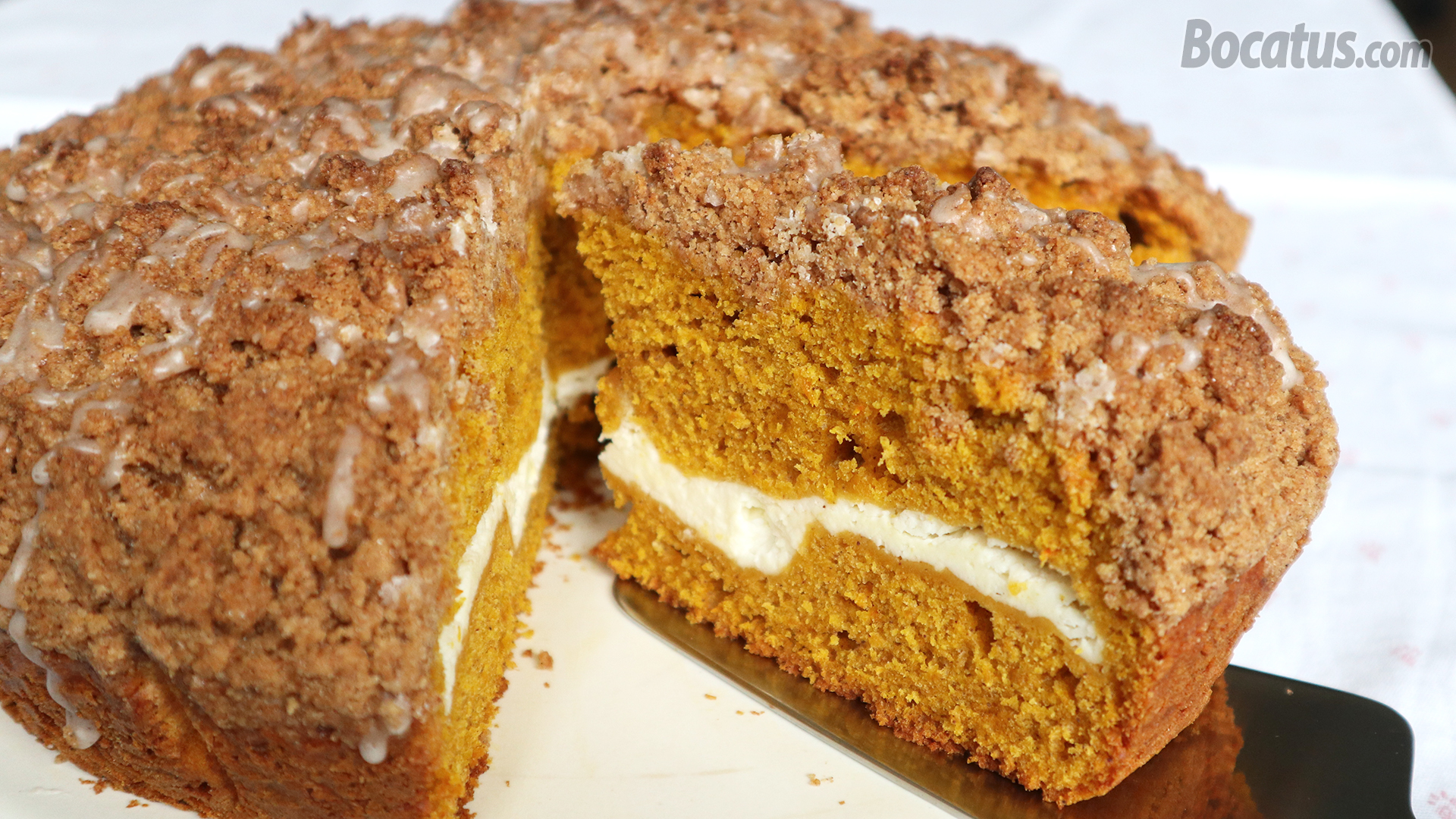 Hoy te traigo un bizcocho de calabaza muy especial, con un relleno de queso crema y una cobertura crujiente que te van a encantar. Queda un bizcocho esponjoso, húmedo y muy aromático, con el toque especiado de la canela, el jengibre y la nuez moscada. En cada bocado disfrutarás de una combinación de sabores y texturas increíbles.